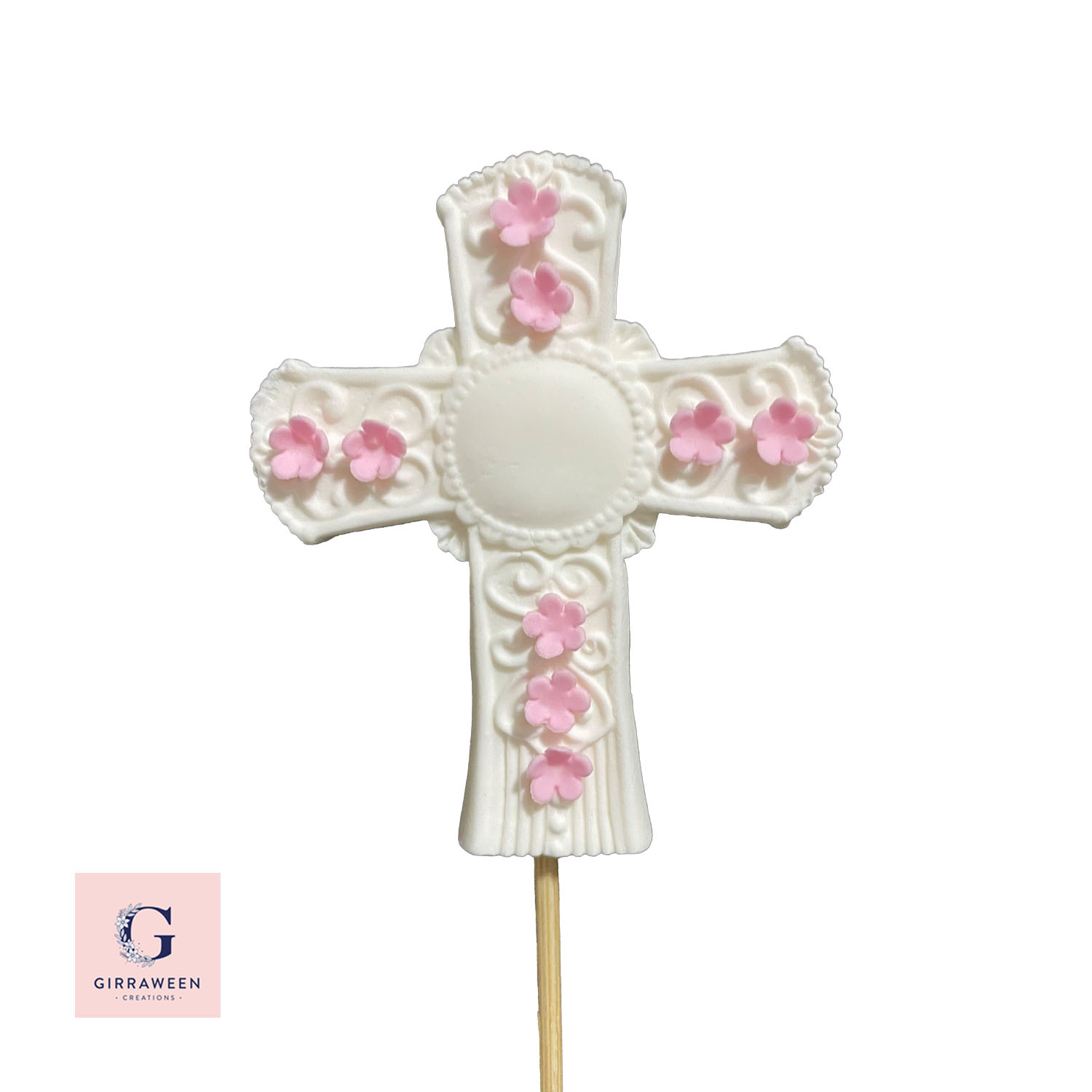 Our Small Sugar Cross with mini blossoms are made using Fondant and Tylose