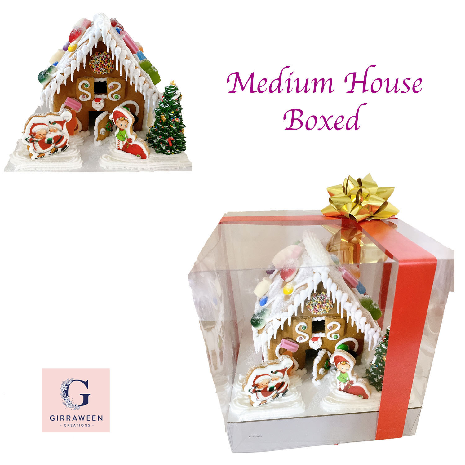 We can add your Company Logo on a Gingerbread Cookie at the front door of the house, company coloured Ribbon or if you have your own printed ribbon we use on the packaging.