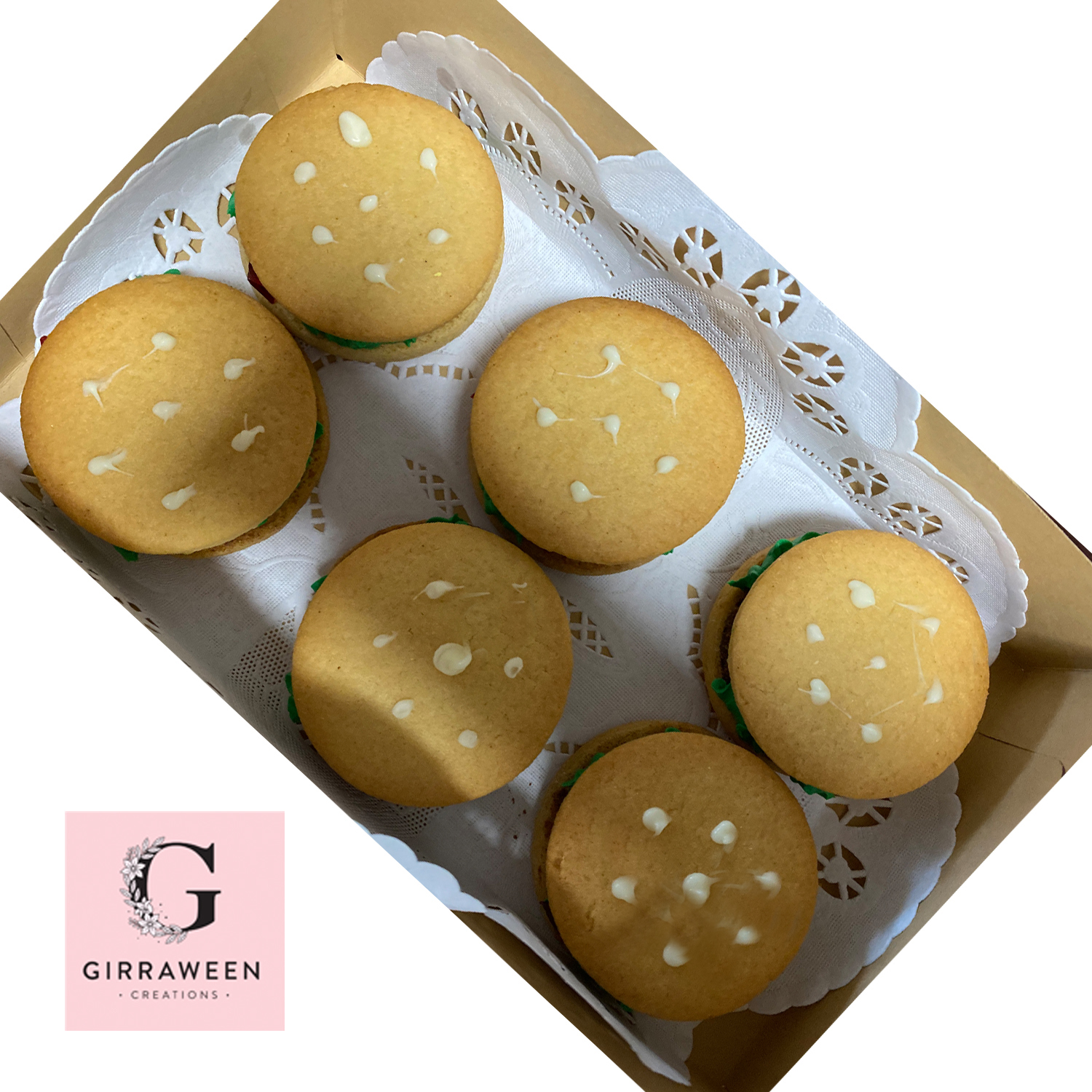 Cookies are filled with a Chocolate Buttercream and vanilla coloured Buttercream