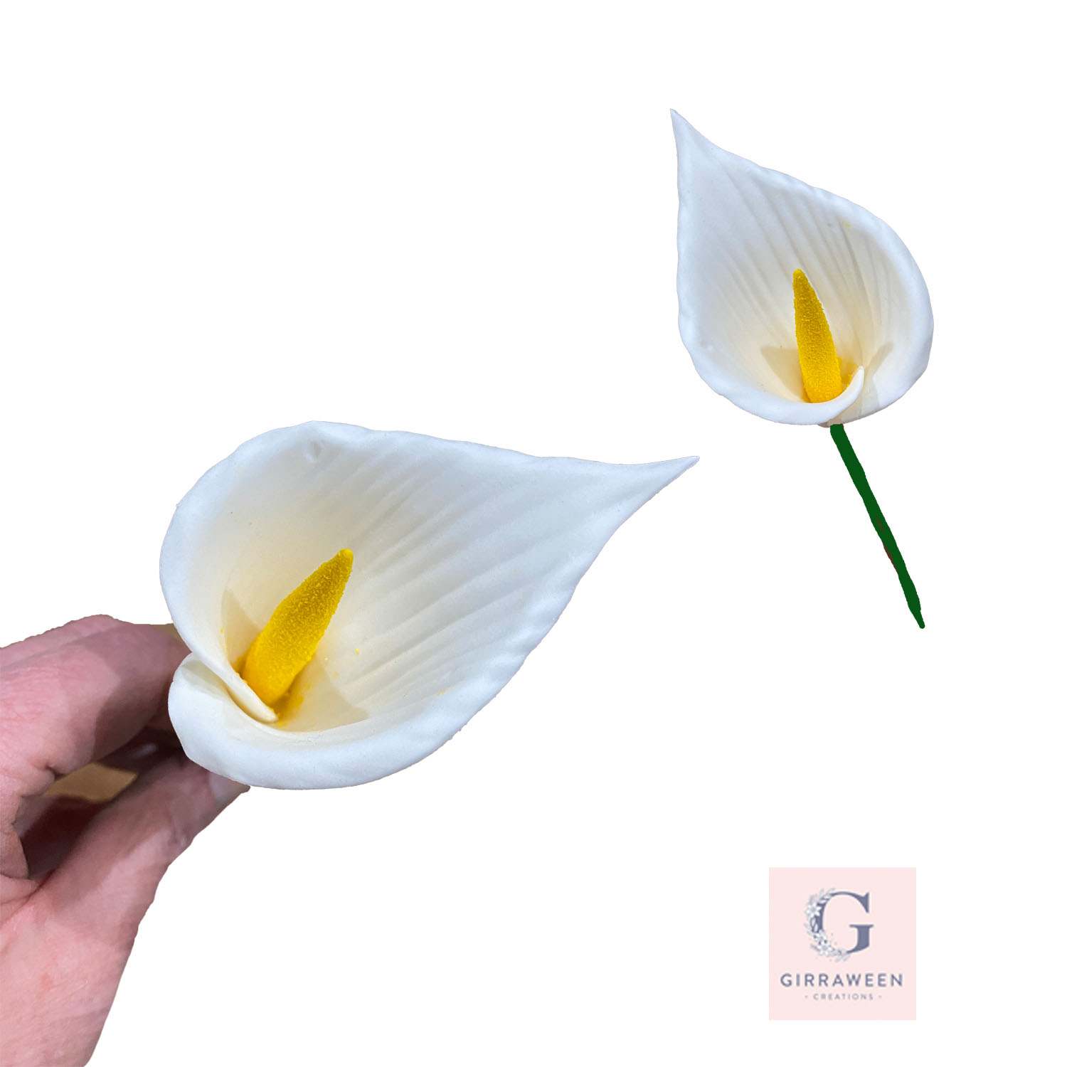 Our Arum Lillies are made with our very own Superfine Flower Modeling Paste (Sugar, Tylose, Gums)