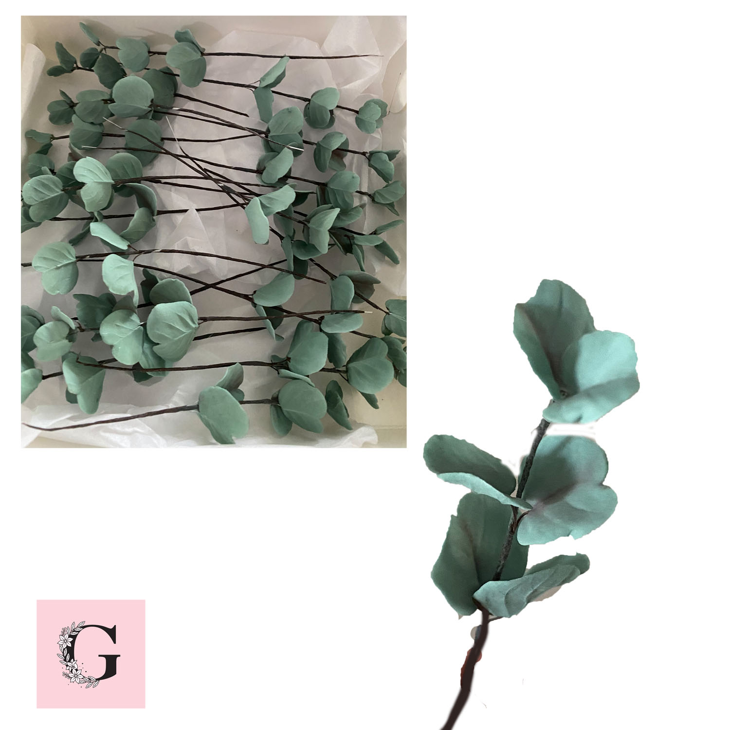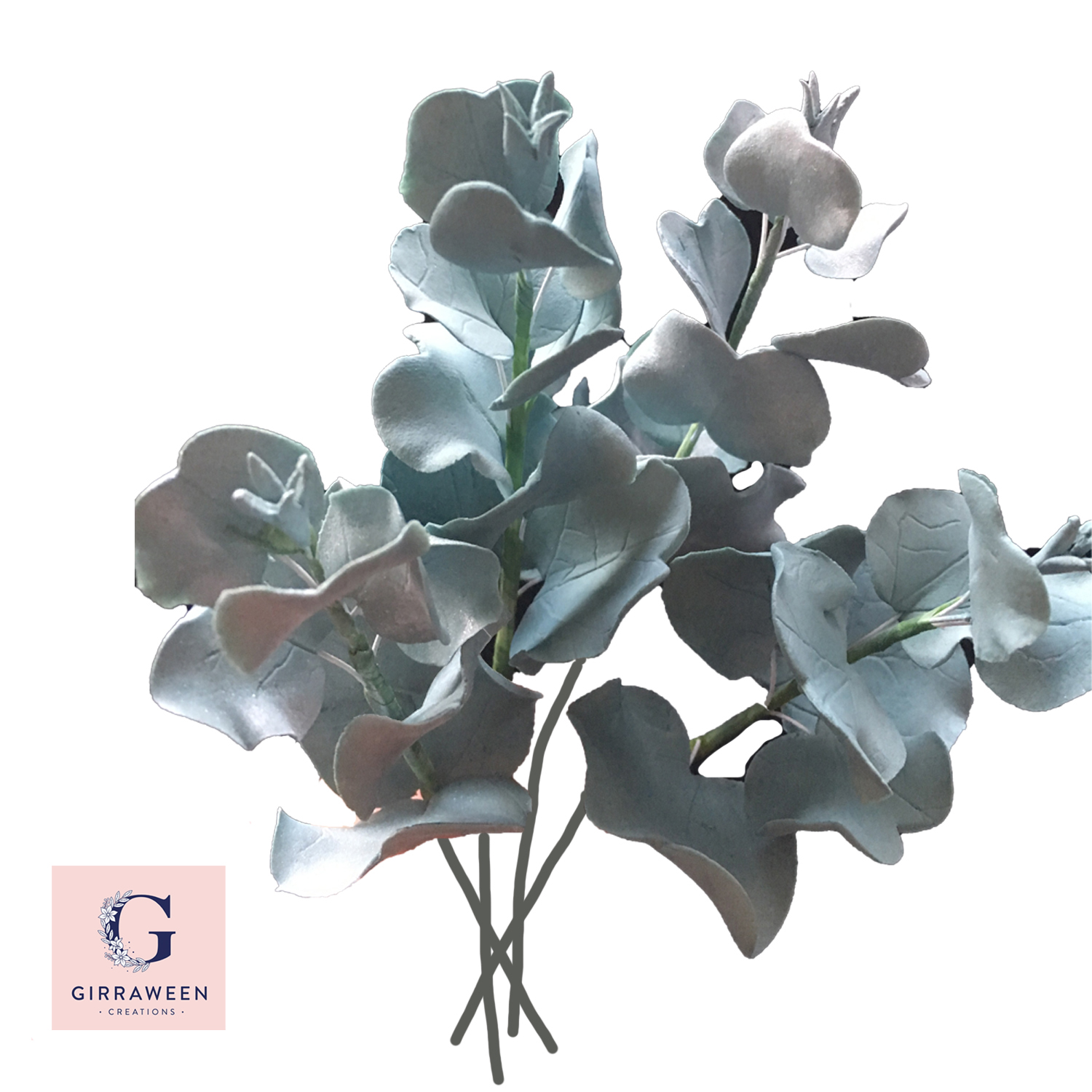 Our  Sugar  Blue Gum Sprigs ( Eucalyptus Blue Gum Leaves) Light Green Leaves  are made using our very own Superfine Flower Modeling Paste (Sugar, Tylose, Gums)